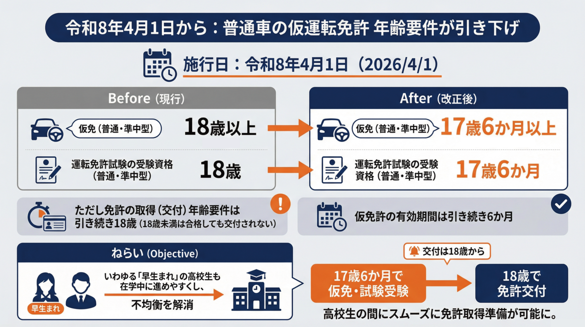 令和8年4月1日より、普通車の仮運転免許証の取得可能年齢が、現行の満18歳から17歳6ヶ月に引き下げられます。