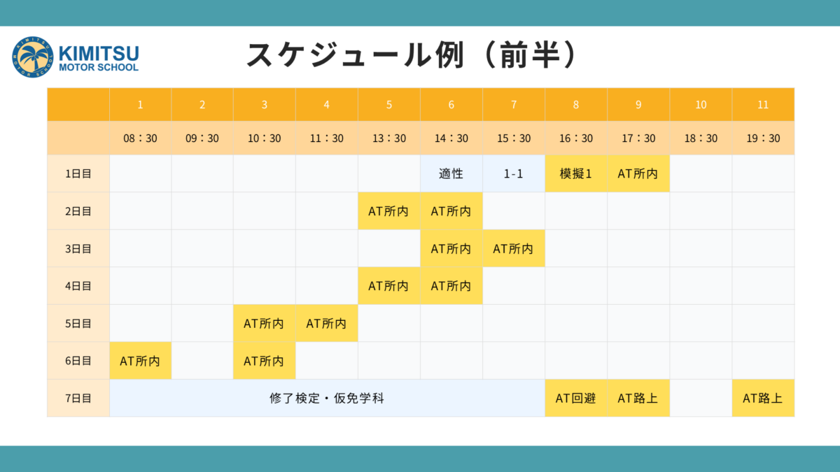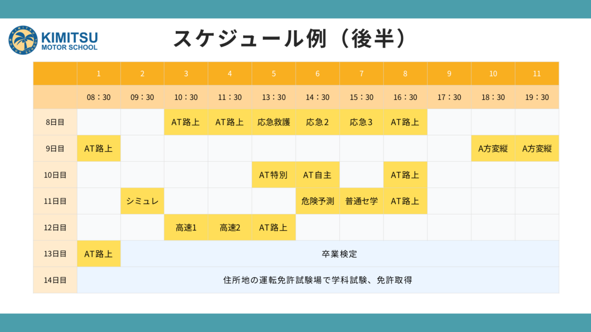 以下は2週間ほどで免許を取得する合宿免許などのスケジュール例です。